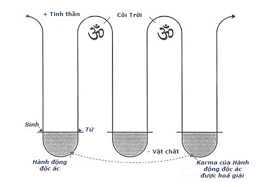 Tác động của karma được minh chứng khá rõ ràng khi chúng ta coi sự sống như sóng hình sin, một sự dao động giữa tinh thần tích cực và vật chất tiêu cực, với tâm thức được hình thành theo dạng sóng. Con người đang trên một hành trình đưa ta ra khỏi cõi thiên đường của tinh thần xuống dần qua các cõi để đến với thể vật chất. Đời sống trong cơ thể vật lý được biểu hiện bởi những lực đẩy thấp nhất của sóng sự sống trong những điều kiện vật chất.