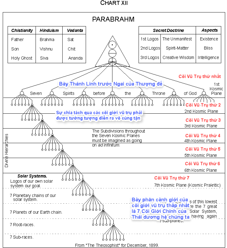 Qui luật 1: Mỗi người tiến trên Đường trong ánh sáng thanh thiên bạch nhật, Nguyên văn tiếng Anh là “The road is trodden in the full light of day”, nếu dịch sát sẽ là “Mỗi người tiến bước trên Đường trong ánh sáng ban ngày”. Từ “Con Đường ở đây có thể hiểu là Con Đường Đạo, Thánh Đạo. Đó là dòng năng lượng mà chúng ta đã mang theo từ khi khởi nguyên của bất kỳ vũ trụ nào, khi quá trình phát lộ vĩ đại diễn ra, và dòng chảy năng lượng đó vẫn nguyên vẹn. Đó là sinh mệnh tuyến—sợi chỉ sự sống—, và chúng ta đánh mất ý thức của chúng ta khi chúng ta ngày càng đi sâu vào các điều kiện bị giới hạn hơn. Tôi không có ý nói rằng chúng ta tồn tại chính xác như là những cá nhân ở cấp độ cao nhất của vũ trụ. Các bạn hãy nhìn vào hình vẽ này mô tả những Xuất lộ từ Parabrahman.