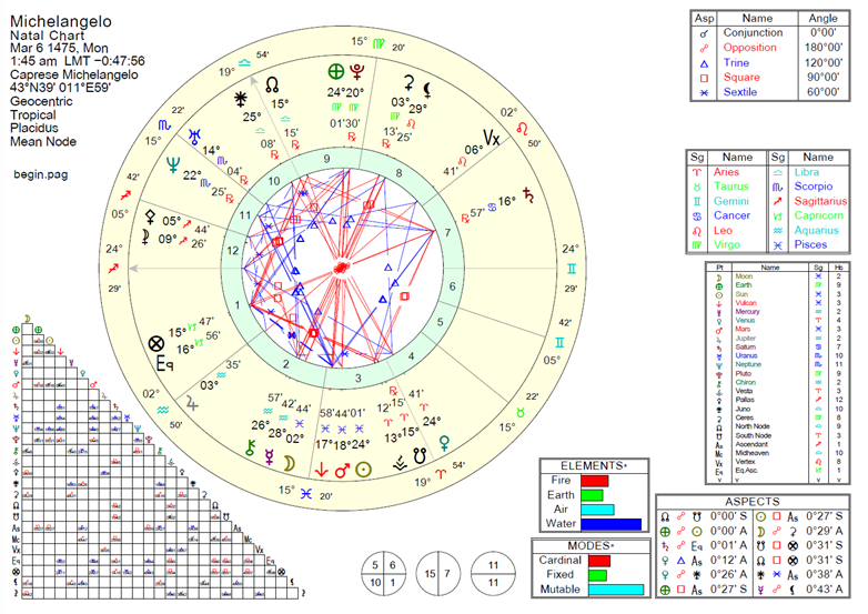 Với mặt trăng Song Ngư đã được thanh luyện thông qua Diêm Vương Tinh (chủ tinh nội môn của Song Ngư), Michel-Ange dường như đã biểu lộ được ý thức nhiệm vụ của mình đối với nhân loại, ông đã tạo ra một cuộc cách mạng mới trong nghệ thuật, nâng tầm ý nghĩa của nghệ thuật lên một mức độ tinh thần cao quý bằng cách thể hiện những ý niệm trừu tượng siêu hình thông qua vẻ bề ngoài của con người trần tục.