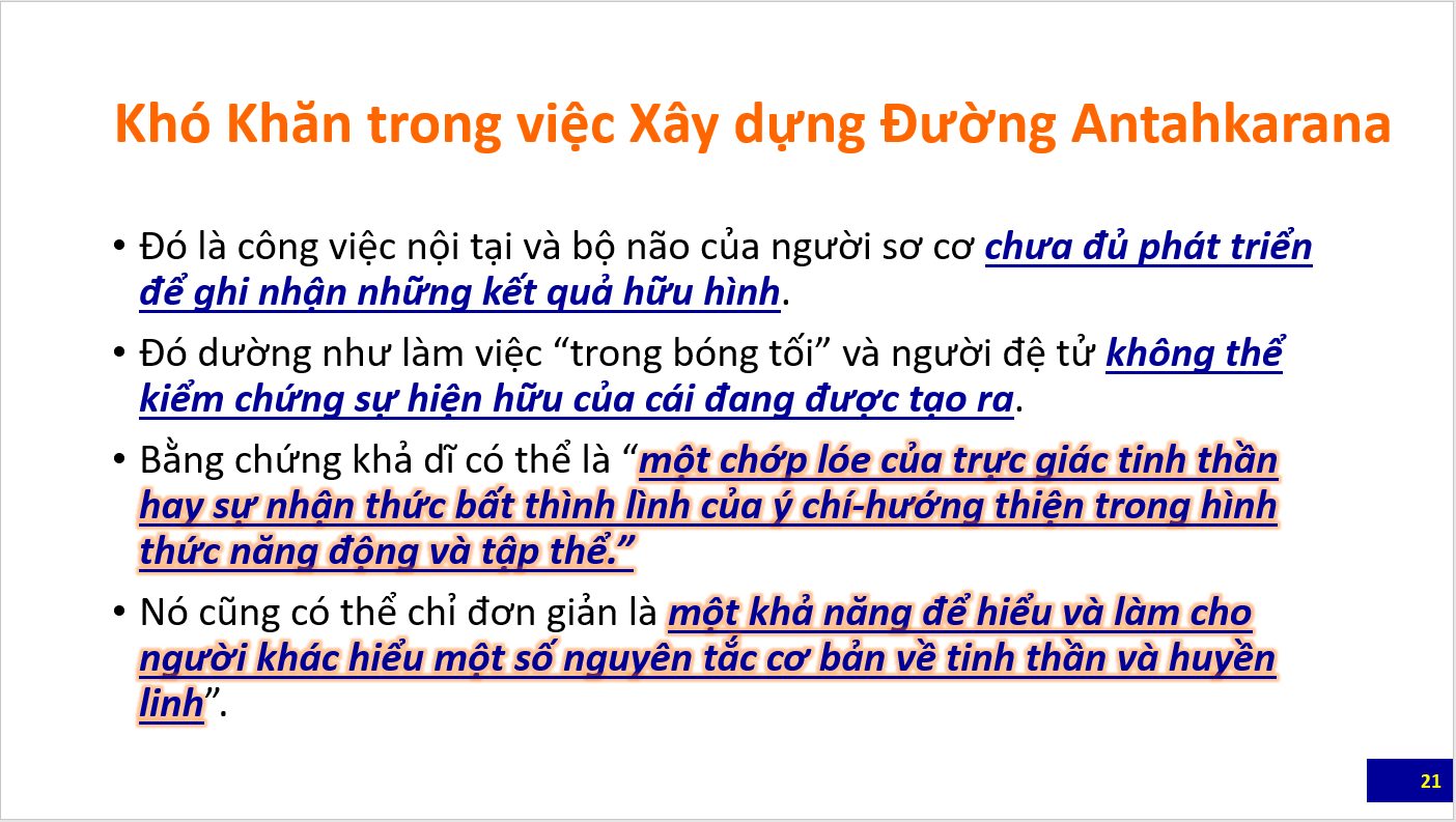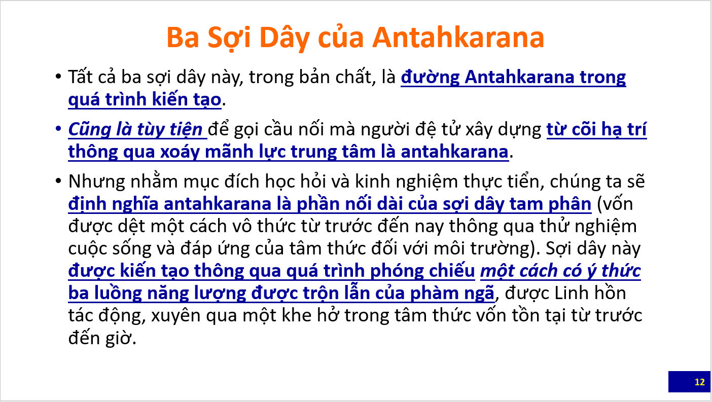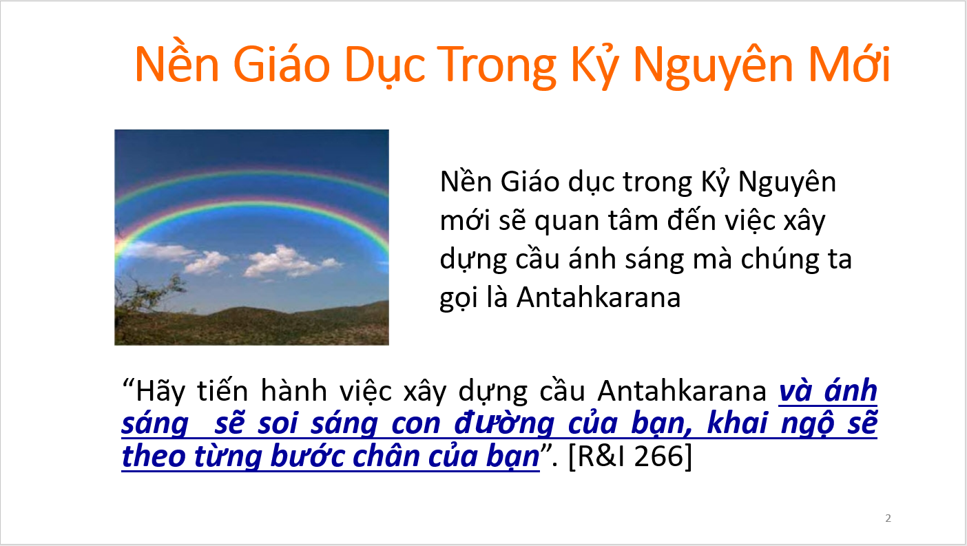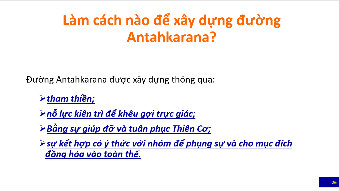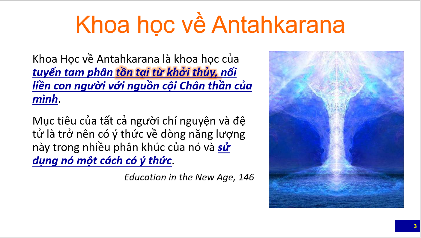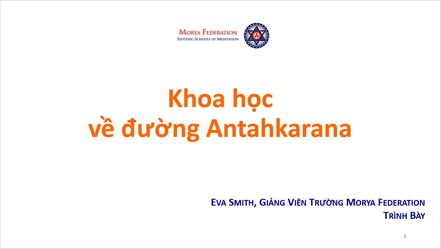 Bài tổng quan đầu tiên là các slide giới thiệu các nét chính về Khoa học của đường Antahkarana do Bà Eva Smith, Giảng Viên của Trường Morya Federation trình bày trong webinar dành cho học viên và công chúng. Các bạn cũng nên xem lại các bài trước đây về Antahkarana để có thể hiểu các slide này. Sau bài này sẽ là loạt bài giảng luận về Antahkarana trích trong The Ray and the Inititaions