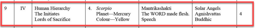 Các bạn hãy nghĩ về Hổ Cáp. Hổ Cáp là một trong những dấu hiệu chính của nhóm Chân thần Nhân loại. Trong bảng sau (Esoteric Astrology trang 35), chúng ta thấy Huyền Giai của Các điểm đạo đồ, các Đấng Chúa tể của Sự Hy Sinh, đó là Huyền Giai của Chân thần nhân loại, được cai quản bởi Scorpio và sao Thuỷ.