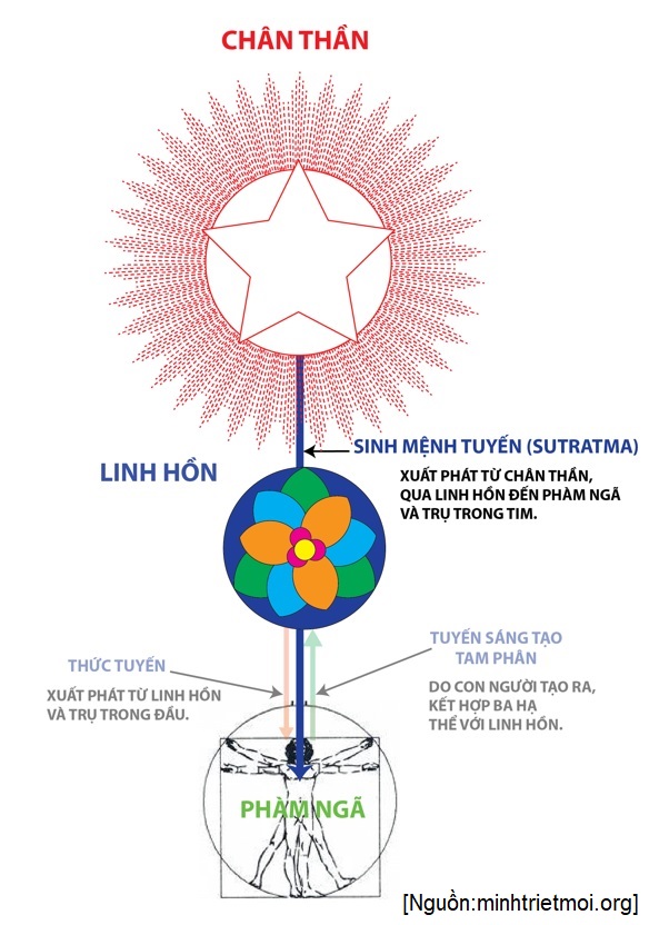 Điều gì xảy ra khi linh hồn lâm phàm. Linh hồn có phần mở rộng như một phần của mình đi vào hình tướng và tạo thành chiếc vỏ áo bên ngoài được gọi là phàm ngã. Thể nguyên nhân luôn ở trên cõi thượng trí, khi nó lâm phàm, không phải toàn bộ thể nguyên nhân, không phải toàn bộ linh hồn đi đầu thai mà chỉ là một phần mở rộng của nó. Và phần mở rộng đó thường được mô tả như hai sợi tuyến, một sợi được gọi là sutratma, sinh mệnh tuyến (life threat, hay còn gọi là sợi dây bạc, silver cord), và sợi thứ hai là Antakarana, tâm thức tuyến (consciousness thread), được gắn vào con người trên cõi hồng trần.