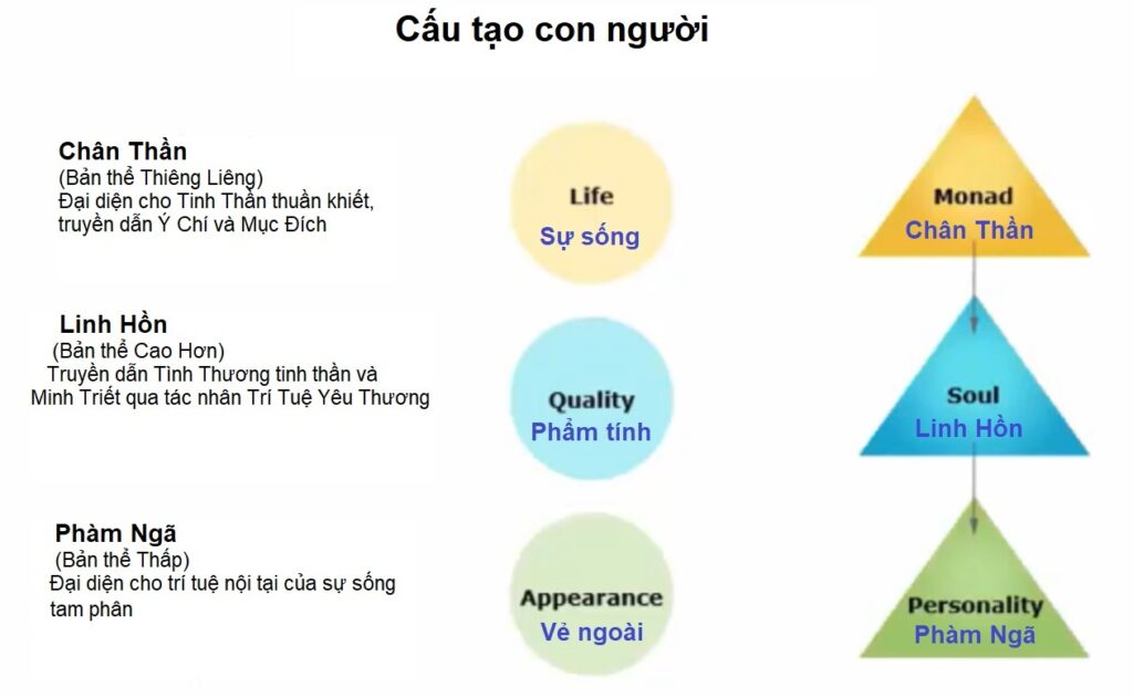 Chúng ta tiến hóa, từ dưới lên trên, từ phàm ngã, đến linh hồn và chân thần. Chân thần là Bản Thể Thiêng Liêng, nó đại diện cho tinh thần thuần khiết và truyền tải ý chí và mục đích và đó là Ý Chí Thiêng Liêng và Mục Đích Thiêng Liêng. Chân thần cũng được gọi là nơi hiện hữu tối hậu, một nơi sâu thẳm bên trong mà ở cấp độ phát triển hiện nay, chúng ta chưa thể tiếp xúc một cách hữu thức, nhưng rồi ngày đó sẽ tới. Đó là nơi bạn kết nối với tất cả mọi thứ thiêng liêng. Và thực sự, đó là Thượng Đế trong bạn. Trong khi linh hồn là Thiên Tính/Phật Tính (Christ) trong bạn thì chân thần là Thượng Đế trong bạn và có bạn.