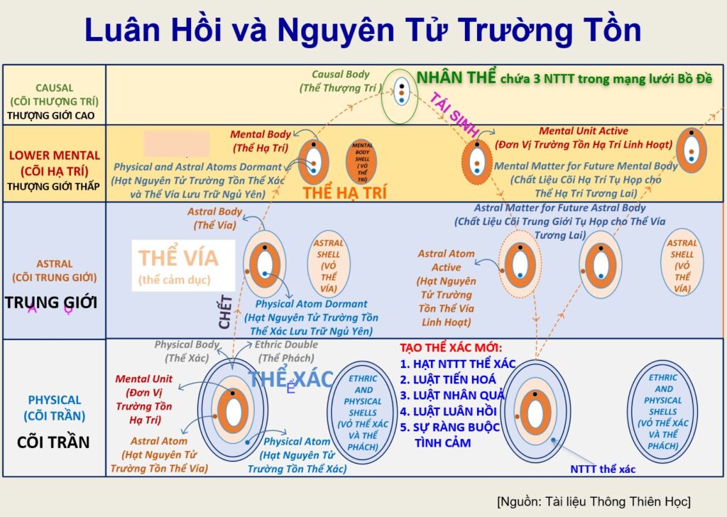 Khi bạn chết, toàn bộ sợi tuyến được rút lên trở về và ba nguyên tử trường tồn này bắt đầu chuyển giao những trải nghiệm tích cực, tốt đẹp vào thể nguyên nhân và chúng trở thành minh triết mới, một năng lực mới. Đó là cách minh triết được đưa vào thể nguyên nhân và chúng được lưu lại trong đó cho kiếp sống tiếp theo của bạn. Nhưng thể nguyên nhân chỉ thu lấy những trải nghiệm tích cực, nó không chấp nhận điều tiêu cực. Sự bất hòa không được cho phép trong thể nguyên nhân.