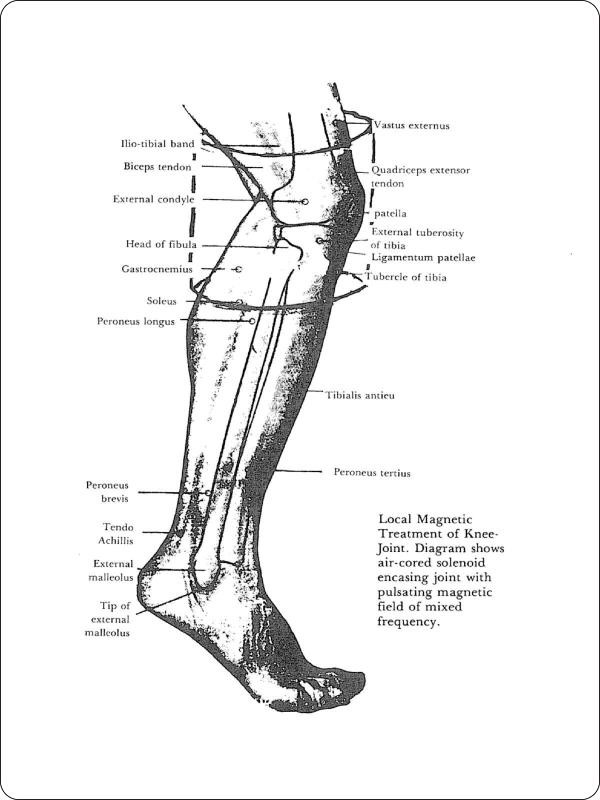 - Từ trường. Trước đây khi thử nghiệm với các từ trường rung động, chúng tôi lưu ý rằng tốc độ lắng máu của bệnh nhân (E.S.R.) đã giảm đáng kể khi các vị trí bị bệnh thông thường được tiếp xúc với từ trường trong điều trị một cách hệ thống (xem Phụ lục I). Sau đó hiệu ứng tương tự được tạo ra trên E.S.R. của bệnh nhân viêm khớp. E.S.R. giảm thấp được coi là một dấu hiệu của điều trị hiệu quả, chúng tôi sử dụng nó như một thước đo trong điều trị viêm khớp với liệu pháp từ trường. Khi E.S.R ở ngưỡng thấp, chúng tôi được khuyến khích tiến hành quá trình trị liệu và có đủ chắc chắn về việc giảm sưng khớp, tăng cường khả năng vận động, và đau đớn do đó cũng giảm dần. Than ôi, không phải tất cả bệnh nhân đều đáp ứng với phương pháp này. Chỉ có thái độ hợp tác và tích cực liên tục từ phía bệnh nhân mới mang lại tiên lượng tốt đẹp. Do đó, yếu tố trên (1) là rất quan trọng. Quy trình chung cho trị liệu bằng từ tính là điều trị tổng thể mỗi tuần hai lần, mỗi lần trong một giờ. Sau đó, dần dần, điều trị tại chỗ được bổ sung. Solenoids (ống từ trường) được đặt gần và thậm chí xung quanh khu vực bị bệnh. Xem hình minh họa ở trang sau và Phụ lục I.