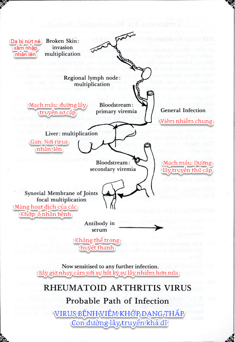 Bây giờ, tác giả sẽ miêu tả các yếu tố là nguyên nhân tồn tại của chứng bệnh này tại Anh Quốc. Con đường xâm nhập vào cơ thể con người là qua da. Tại Anh Quốc, chúng ta thường bị xước xát trên da ở vị trí ngón tay và ngón chân, đặc biệt là ở khe ngón chân cái. Tiết trời ẩm ướt và thiếu sự chăm sóc kỹ lưỡng ngón chân đã tạo điều kiện cho việc nứt da kẽ ngón chân. Virus phát tán qua những vật nuôi trong nhà, và chó thường là thủ phạm chính. Không có một quốc gia nào người dân yêu chó hơn ở Anh. Chó nuôi sẽ mang virus bệnh viêm khớp dạng thấp đến những ngón tay, những ngón tay lại mang virus đến khăn lau, và việc dùng chung những khăn lau này trên bề mặt da khiến gây nhiễm cho cả gia đình. Không có gì đáng ngạc nhiên khi tình trạng bệnh này có xu hướng gia đình, đặc biệt khi chó vẫn được quan tâm như là một thành viên trong gia đình, như vẫn thường thấy! Bất cứ ai chăm sóc chó khi thời tiết lạnh sẽ nhận ra sự đau đớn và độ cứng của khớp mà họ có thể gặp phải, đặc biệt ở người cao tuổi.