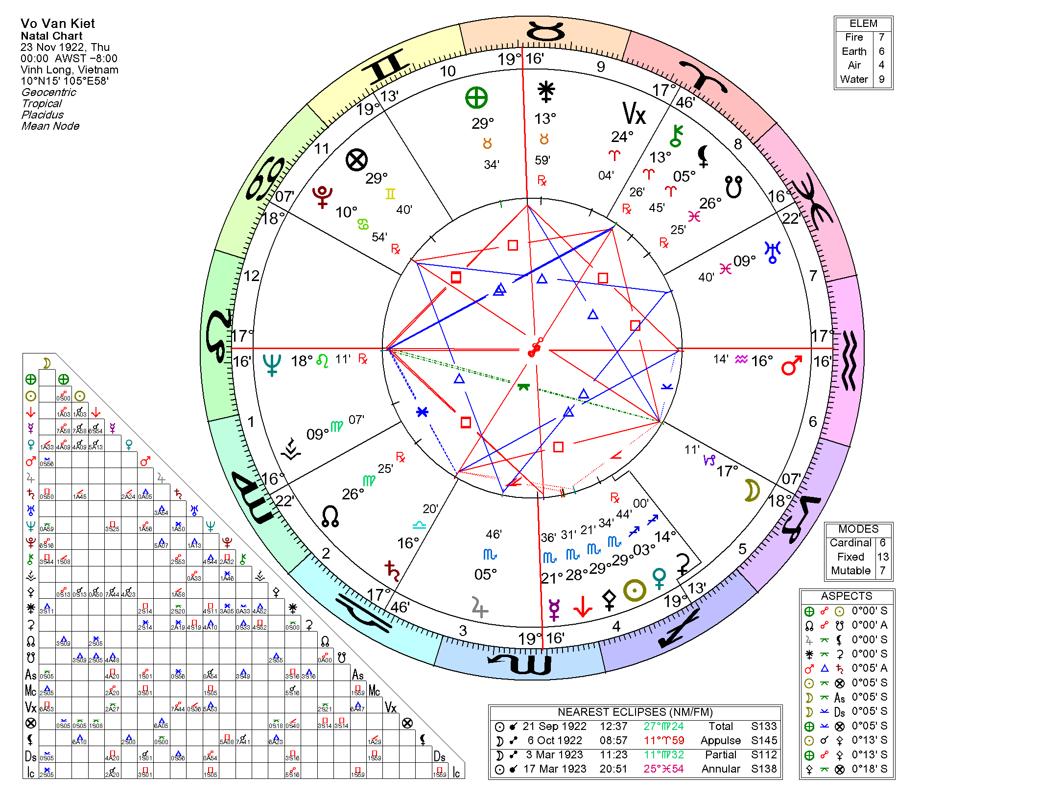 Tôi thử chiêm nghiệm điều này với một vài cá nhân Hổ Cáp, và tôi thấy quả đúng như vậy. Nguyên Thủ Tướng Võ Văn Kiệt (sinh ngày 23-11-1922, giờ sinh không rõ), là một ví dụ của mặt trời Hổ Cáp. Do không biết giờ sinh, chúng tôi tạm lấy 00:00 AM, và Ông có mặt trời Hổ Cáp ở 29°34, decanate thứ 3 của Hổ Cáp, sắp chuyển qua dấu hiệu Nhân Mã. Trong dấu hiệu Hổ Cáp còn có 3 hành tinh khác là Sao Mộc, Vulcan, Sao Thuỷ, và đặc biệt Sao Kim ở Nhân Mã đồng vị với mặt trời, một Stellium, rất nổi bật. Ở điểm này, ông khá giống với Tổng Thống Mỹ Joe Biden, cũng có Sao Kim đồng vị Mặt trời, và ở 2 con người này, chúng ta có thể nói Sao Kim (Thái dương Thiên Thần) đã “ghé mắt nhìn xuống” và ánh sáng của linh hồn đã soi sáng hai ông. Cuộc đời của ông, rất giống cuộc đời Tổng Thống Mỹ Joe Biden, đã trải qua rất nhiều đau khổ và mất mát. Ông mất vợ và hai con nhỏ năm 1966 trong chiến tranh, và sau đó, người con trai lớn của Ông là Phan Chí Dũng cũng mất trong chiến tranh năm 1972. Thật là một sự tương đồng kì lạ giữa hai con người Hổ Cáp! Tổng Thống Mỹ Joe Biden cũng mất vợ và con trong một tai nạn xe hơi, và sau này lại mất tiếp người con trai mà ông rất yêu thương. Và, như thầy Hiệu trưởng đã nói, ở hai ông, đau khổ đã làm công việc của mình, và đã mang “Ánh Sáng và Tình Thương” đến hai con người này. Tôi đồng cảm với nhận xét này, vì ở nguyên Thủ Tướng Võ Văn Kiệt, tình thương đã nảy nở trong ông thay cho thù hận. Ông không căm thù những người đã gây ra cho ông những đau khổ và mất mát, mà thay vào đó ông nhắc đến ‘hoà giải’, xoá bỏ thù hận. Lời của ông trong những năm cuối đời thật ý nghĩa “Chiến thắng của chúng ta là vĩ đại, nhưng chúng ta cũng đã phải trả giá cho chiến thắng đó bằng cả nỗi đau và nhiều sự mất mát. Lịch sử đã đặt nhiều gia đình người dân miền Nam rơi vào hoàn cảnh có người thân vừa ở phía bên này, vừa ở phía bên kia, ngay cả họ hàng tôi cũng như vậy. Vì thế, một sự kiện liên quan đến chiến tranh khi nhắc lại, có hàng triệu người vui, mà cũng có hàng triệu người buồn. Đó là vết thương chung của dân tộc cần được giữ lành thay vì lại tiếp tục làm cho nó thêm rỉ máu…”